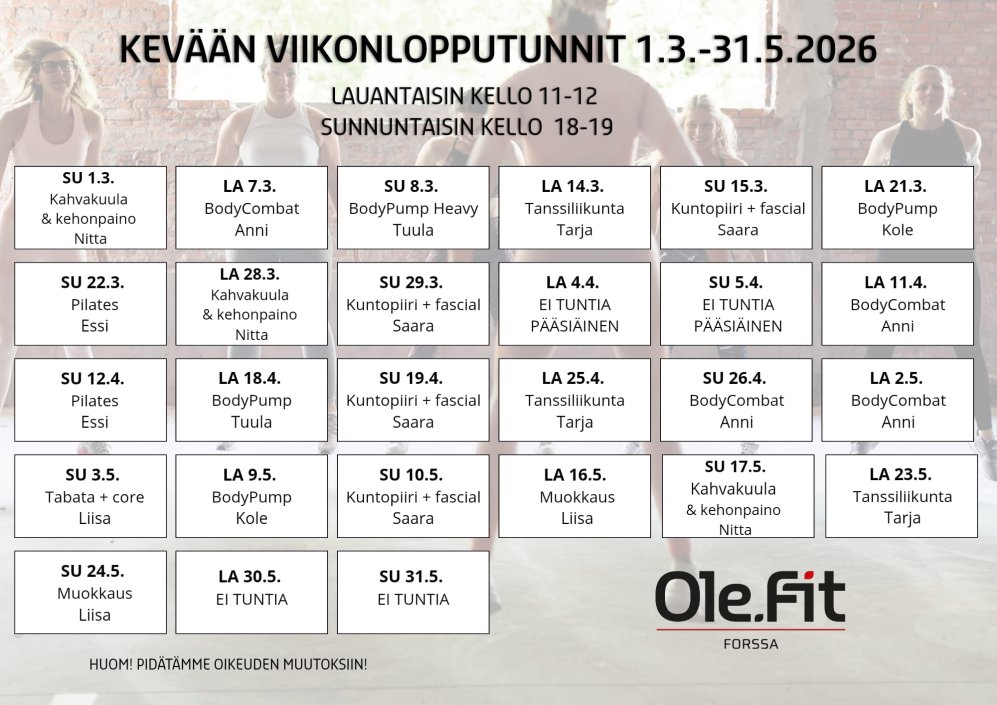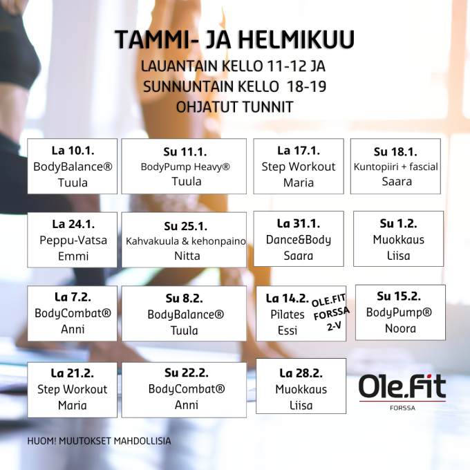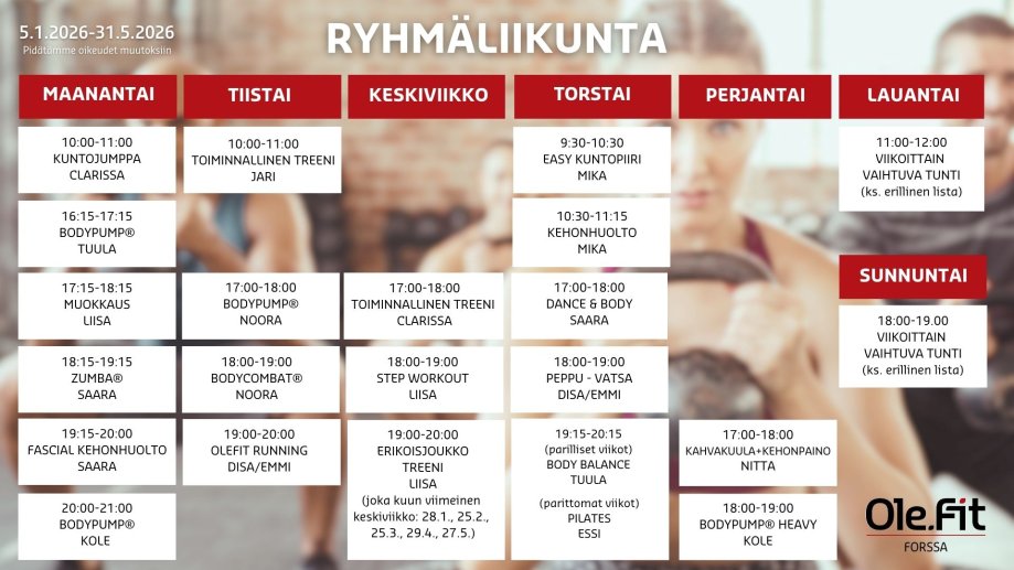 Ryhmäliikunta-aikatauluun olemme saaneet paljon toiveita, joita olemme kuunnelleet ja ryhmäliikunta-kalenterimme on suunniteltu juuri sinua varten.